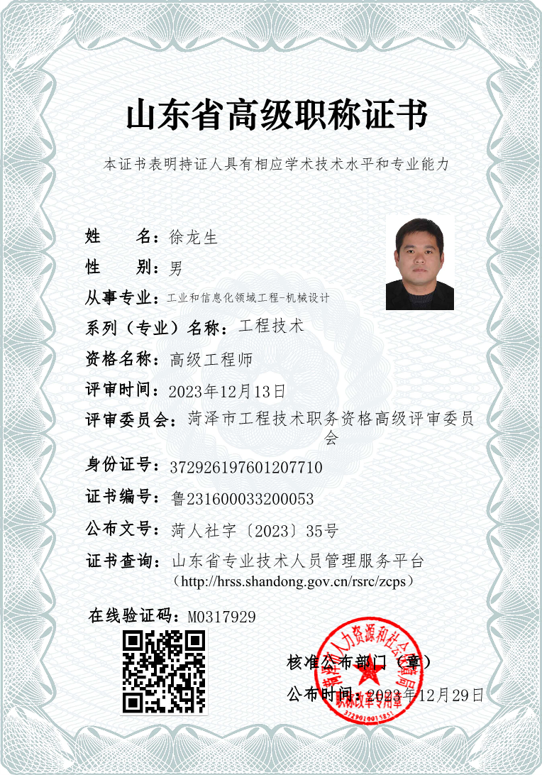 徐龍生同志榮獲“山東省高級(jí)工程師”榮譽(yù)稱號(hào)